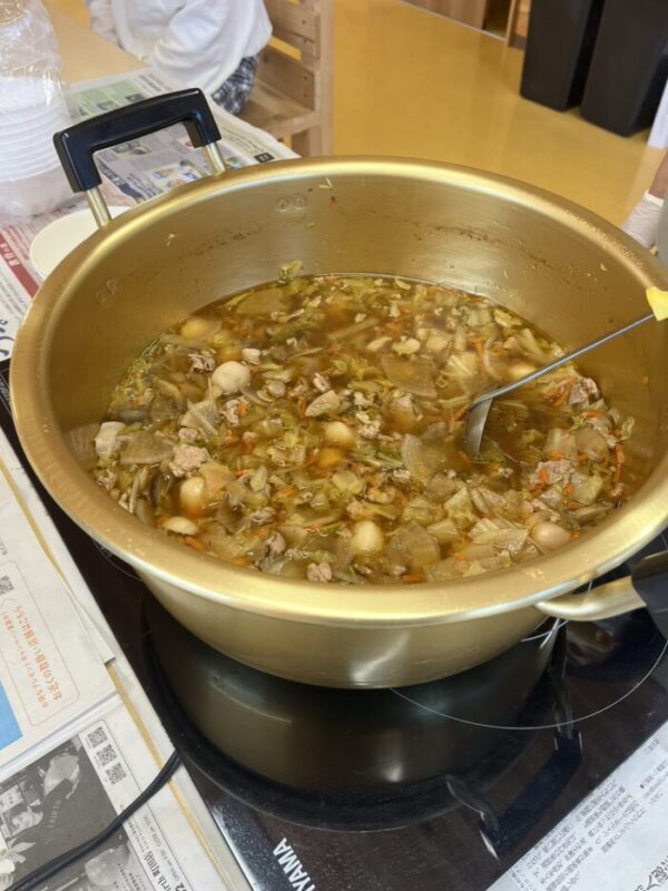 当日、利用者さん達は午前活動を行っている間、職員は大鍋に野菜・肉等を丁寧に煮込んでいました。